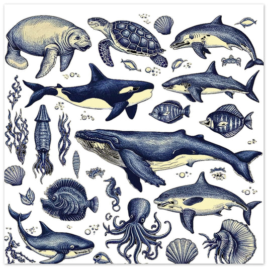 Sea Life Giclee Fine Art Poster, Whales, Seal, Turtle, Shark, Octopus