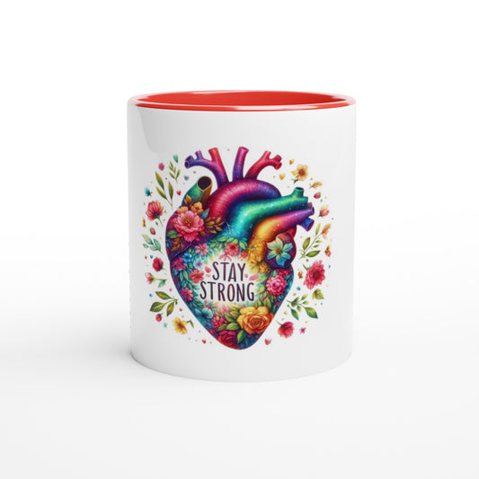 Stay Strong Heart Design Ceramic Mug – 11oz Glossy White with Colorful Accents